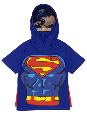 These costume-style tees feature superheroes Batman, Superman, or Flash from The Justice League. Now he can transform into his favorite character in seconds with the attached hood, mask, and cape! Mask partially covers the face. Cape is detachable. Body:60% Cotton/40% Polyester; Mask: 100% Polyester; Cape:100% Polyester. Machine washable. Imported.