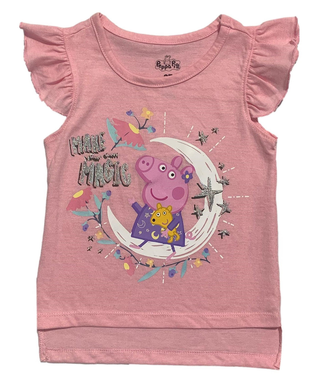 Girls' t-shirt features Peppa Pig and Friends from the Peppa Pig tv series. These graphic tees have short sleeves and are tagless. Designs include inspirational phrases "Make Your Own Magic" and "Find Joy in the Little Things". In Pink or Barely Blue. 60% Cotton/40% Polyester. Machine washable. Imported.