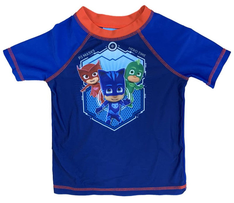 Toddler boys' rash guard features Catboy, Gekko, and Owlette from Nickelodeon's PJ Masks series. Pair with your favorite swim trunks for a worry-free day in the sun. Excellent UPF 50+ UV protection. Quick-dry material. 85% Polyester/15% Spandex. Machine washable. Imported.