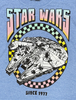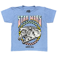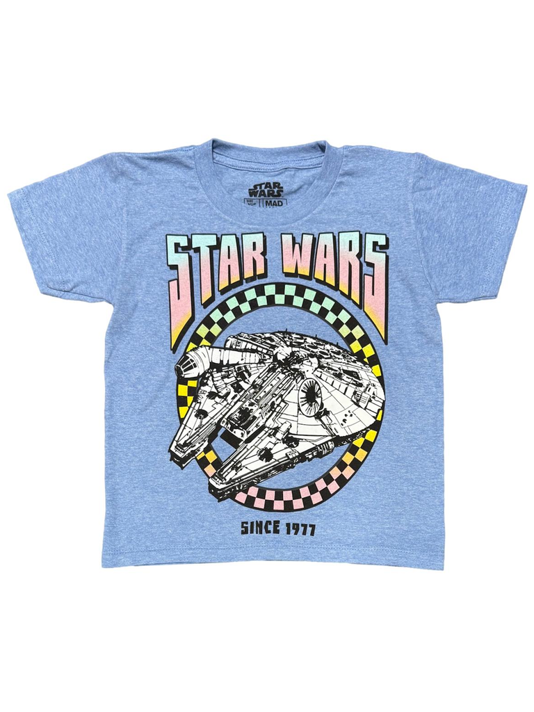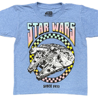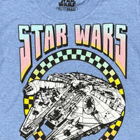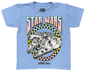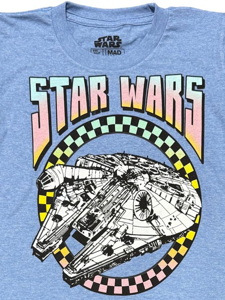 Little boy's t-shirt features graphic of the Millennium Falcon from the original Star Wars series. The shirt is crew neck and tagless for comfort. In light blue heather. 60% Cotton/40% Polyester. Machine washable. Imported.